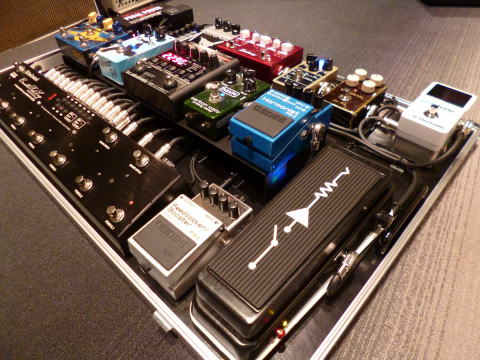 エフェクターの配置もリアルタイムで操作したいエフェクターなどは2段目に配置し底上げ台の設置をお願いしたのですが、とても操作しやすく、演奏しながらでもディレイのタップテンポの設定や、トレモロのモード切り替えなどスムーズに行う事が出来ました。