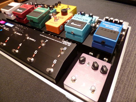 この様に床上げして各エフェクターを設置しておりますので、立体感があるボードになっています。今回ボード自体が既製品の「PULSE製」という事で、嵩上げ台の高さには結構迷いました。何せ、ES-8のSend/Returnジャックにプラグを挿すとその高さ45mmにもなるのです。(とは言えPULSEはケースメーカーとしては深めの100mm)