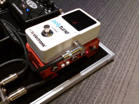 今回この上にt.c.electronic Polytune2を設置。視界性も良くなりスペースも削減出来ますが、一方でボードの蓋の厚みが心配になりますね。これはギリギリ100mmで抑えられましたが、ごく一般的なボードの場合は内寸~80mmという事で蓋が閉まらなくなる場合が御座いますので予めご注意を。
