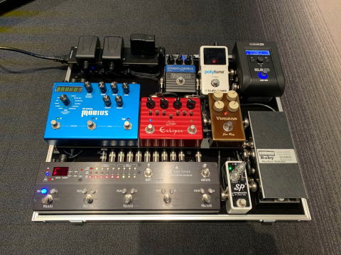 アンプより手前に接続する"Pre Effects"のみをボードに収納するというご意向通り、ボード内にはXotic SP Compressor、Vemuram JanRay、Suhr Eclipseに加えてE.W.S Stereo Chorus Mod、Strymon Mobiusを設置。