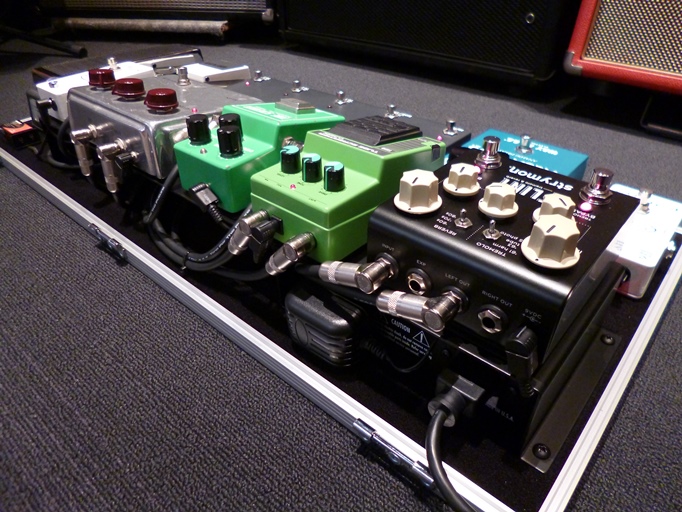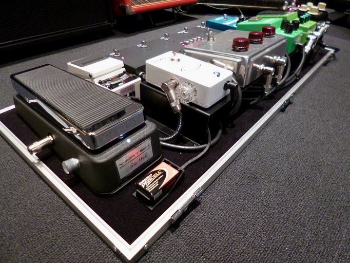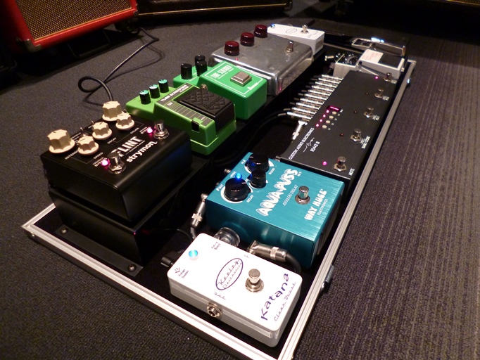 最初にお願いしたときは、現在のJMが使用しているペダルボードと同じように、歪みはCENTAURとTS808 vintageのみだったのですが、以前ずっと使用していたTS10で当たりのものを入手することができ、どちらも入れてしまおうと考え、ペダルの配置を変更させていただきました。