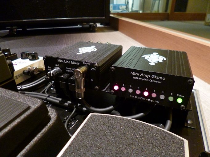 このMini Amp GizmoはMIDIスイッチャーからのMIDI情報信号を最大8系統のスイッチ信号に変換する機器です。ここから専用のケーブルでアンプに接続する事によって、MIDIプログラムNo.毎にアンプのch.やBoost、Reverbなどを呼び出す事が出来ます。